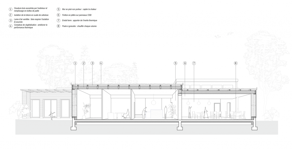 Le souhait de la maitrise d’ouvrage consiste en la construction neuve d’un centre de méditation en conception bioclimatique passive, tout en employant au mieux les ressources du terrain. Le bâtiment se compose de deux grandes salles, accueillant les espaces de méditation et d’activités, situées de part et d’autre d’un volume central pour l’accueil et les locaux techniques, sur une surface totale de 800 m². Les parois extérieures à ossature bois sont remplies de bottes de paille afin d’obtenir une isolation performante et de favoriser le circuit court. A l’intérieur, des murs de refend sont proposés en terre crue, suivant la technique du pisé, pour capter la chaleur, réguler la température et l’hygrométrie des espaces. Une pergola est aménagée en façade sud pour prévenir de la surchauffe éventuelle des vitrages et d’assurer le confort estival des usagers.